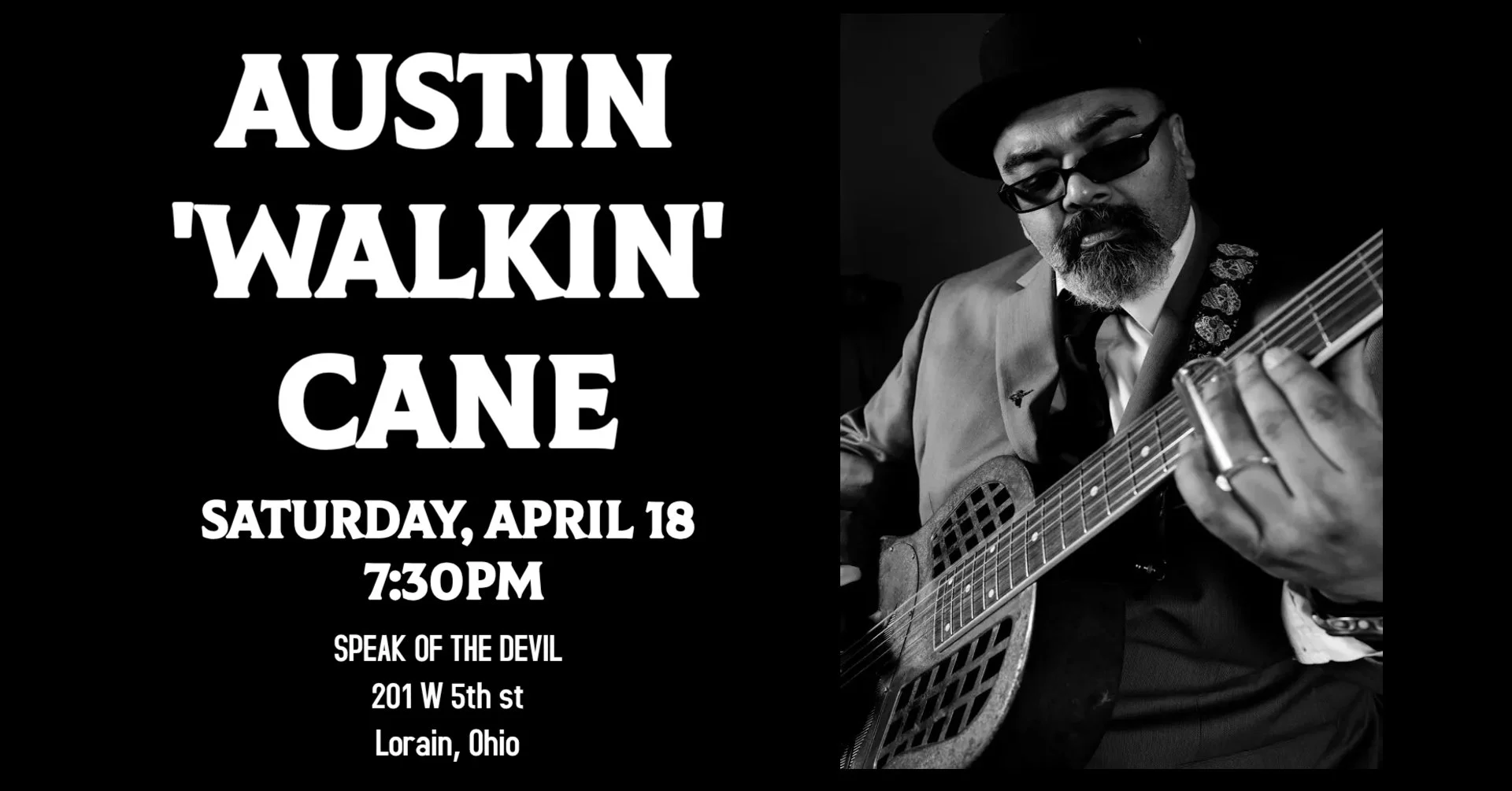 Back to All Events Live Music: Austin 'Walkin' Cane Saturday, April 18, 2026 7:30 PM 10:30 PM Speak of the Devil Cocktail Bar 201 West 5th Street Lorain, OH, 44052 United States (map) Google Calendar ICS Austin 'Walkin’ Cane is a one-man blues performer known for his slick guitar work, and a deep, weathered vocal style. Rooted in Delta blues tradition, his sets deliver a raw, rhythmic sound that feels both traditional and immediate.
